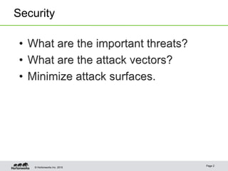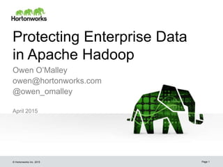 The document discusses various aspects of enterprise data protection in Apache Hadoop, focusing on security architecture and potential attack vectors. It highlights threats such as accidental damage, remote access, eavesdropping, unauthorized user access to private data, and physical access. Additionally, it covers HDFS encryption and details about the encryption scheme and keyprovider API.
