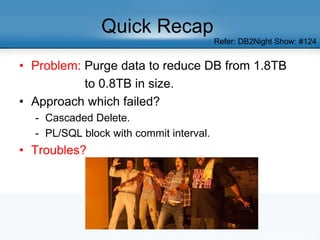 The document describes an algorithm used to purge data from a large IBM DB2 database to reduce its size. Key steps included:
