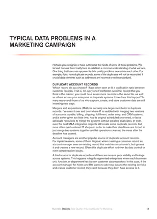 This document discusses improving data quality for marketing effectiveness. Typical data problems include duplicate records, incomplete data, and incorrect data. Marketing benefits from quality data through having an accurate view of customers to effectively target communications. The best way to address data quality is as close to the source as possible, such as validating data during web form submissions. Various opportunities for cleansing data exist, such as during transactional updates, from external data feeds, when migrating legacy data, and through regular maintenance of existing data. Ensuring high quality data is important for marketing success.