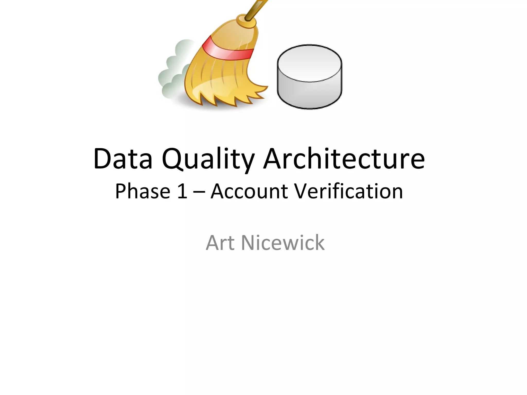 The document outlines the first phase of a project aimed at improving data quality through an architectural framework focused on account verification. Key objectives include creating a flow diagram for data governance, reporting data inconsistencies, and ensuring proper deletion of accounts. The initiative emphasizes consistency reports and monitoring processes to correct and manage data effectively.