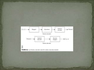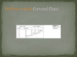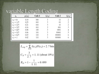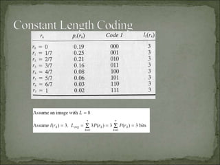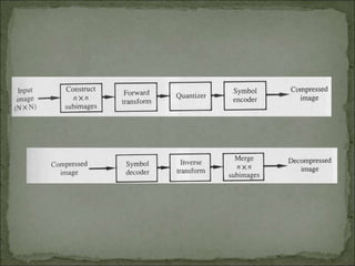 The document discusses various techniques for image compression. It describes how image compression aims to reduce redundant data in images to decrease file size for storage and transmission. It discusses different types of redundancy like coding, inter-pixel, and psychovisual redundancy that compression algorithms target. Common compression techniques described include transform coding, predictive coding, Huffman coding, and Lempel-Ziv-Welch (LZW) coding. Key aspects like compression ratio, mean bit rate, objective and subjective quality metrics are also covered.