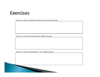 This document discusses floating point numbers and how they are represented in computers using binary rather than decimal. It notes that floating point numbers are approximations and certain calculations may result in numbers like 0.999999999 instead of the expected 1. This is due to the limitations of binary representation. It then explains how floating point numbers use a significand and exponent to represent a wide range of values with limited precision. Finally, it provides some examples of converting between decimal and IEEE 754 single-precision floating point format.