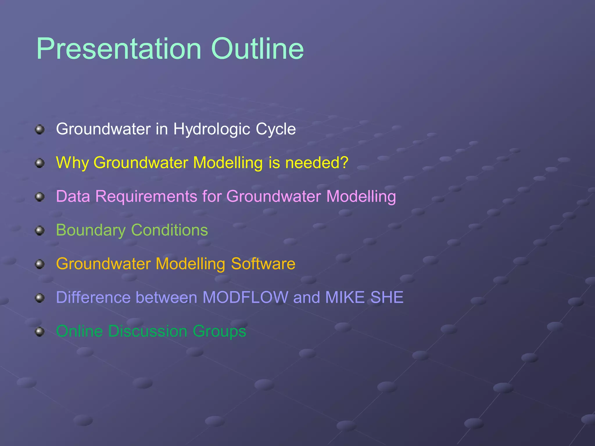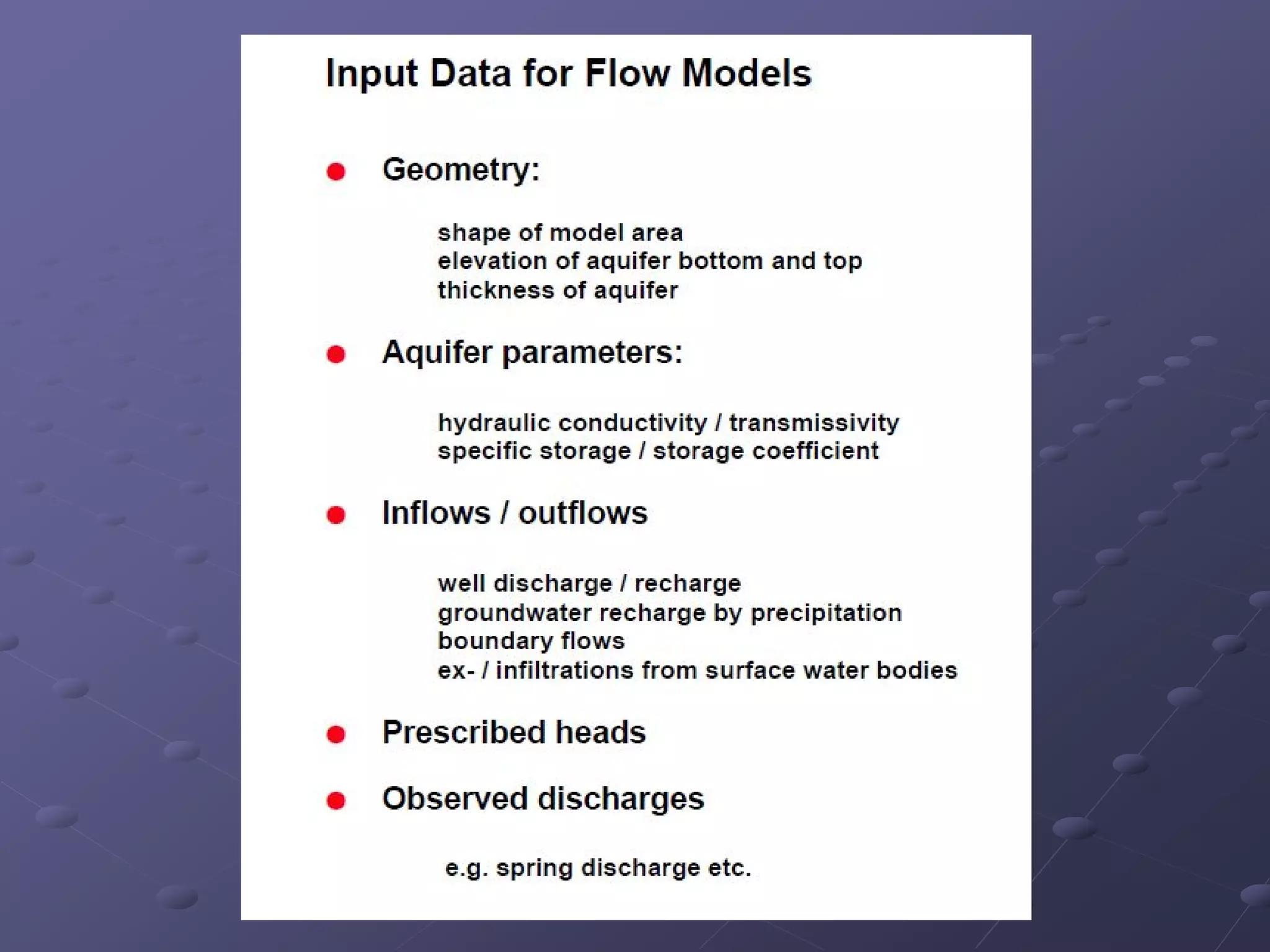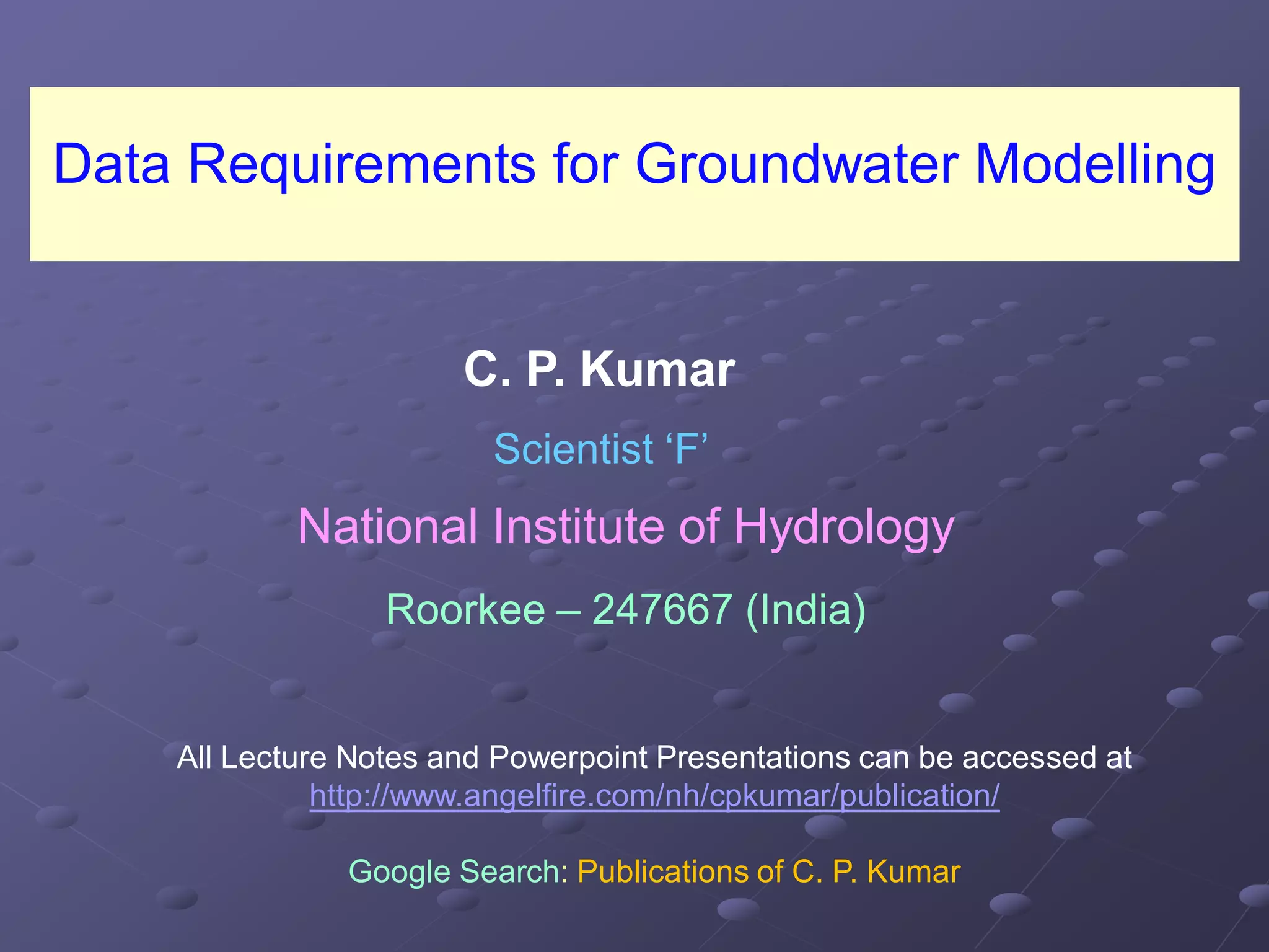 Groundwater modeling requires data on the physical and hydrological framework of the aquifer. The physical framework data defines the aquifer geometry and properties, including topography, geology, aquifer thickness and boundaries. The hydrological framework data describes the flow in and out of the aquifer, such as water table elevations, recharge and discharge rates and areas. Collecting these types of data from existing sources and monitoring programs is the first step of any groundwater modeling study.