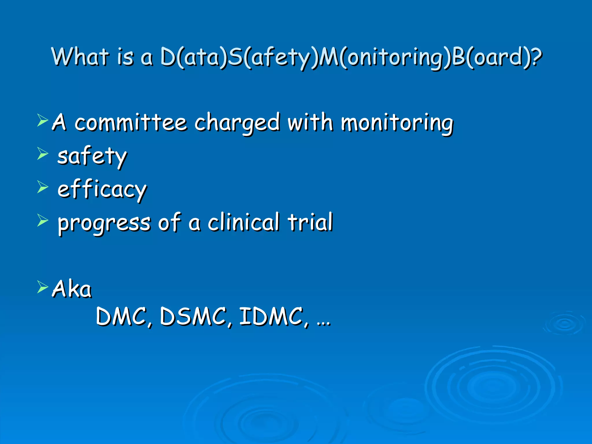 A Data and Safety Monitoring Board (DSMB) is a committee that monitors clinical trials for safety, efficacy, and study progress. A DSMB reviews data at regular intervals to ensure the well-being of trial participants and the validity of the study results. The composition of a DSMB includes experts in relevant medical fields as well as statisticians. A DSMB makes recommendations to investigators and sponsors regarding continuation, modification, or termination of a trial based on their periodic assessments.