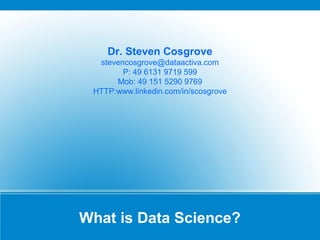 This document discusses data science and provides examples of how data science has been applied in various industries. It defines key components of data science including data acquisition, data munging, math/statistics/data mining, and data visualization. It then provides several case studies showing how data science has been used to develop customer segmentation models, create scored customer databases, conduct online customer panels, model customer preferences, and conduct structural equation modeling. The case studies demonstrate how data science can help target customers, increase product usage, and inform strategic business decisions.