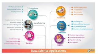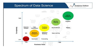 The document provides an extensive overview of data science and business analytics, detailing the evolution, applications, and interrelationships with areas like artificial intelligence and machine learning. It discusses the lifecycle of data science, tools, algorithms, and various case studies, emphasizing the significance of data in modern decision-making. Additionally, it highlights the multifaceted nature of data science as a blend of statistics, programming, and domain knowledge to extract valuable insights from large datasets.