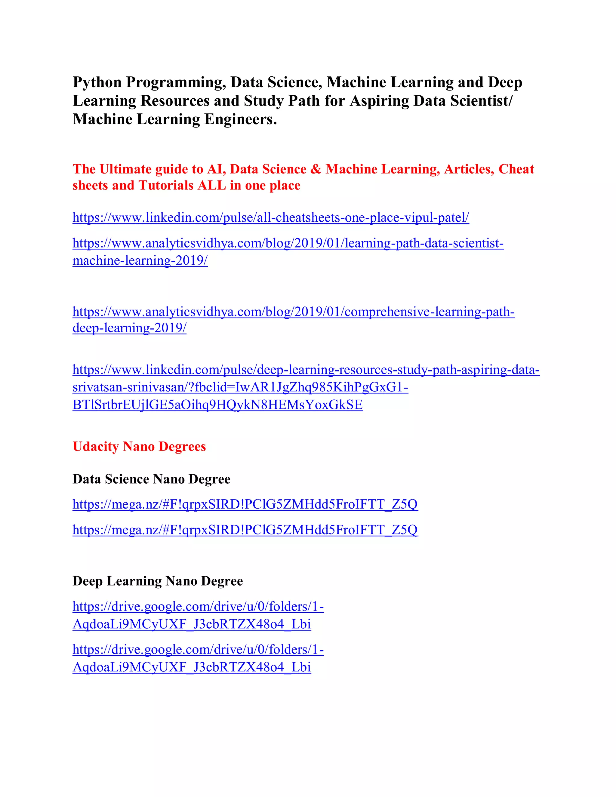 The document provides a comprehensive guide for aspiring data scientists and machine learning engineers, outlining key resources, study paths, and career advice. It includes links to online courses, tutorials, and recommended readings in areas like Python programming, data science, statistics, and machine learning. Additionally, it emphasizes the importance of practical experience and ongoing learning in the field.