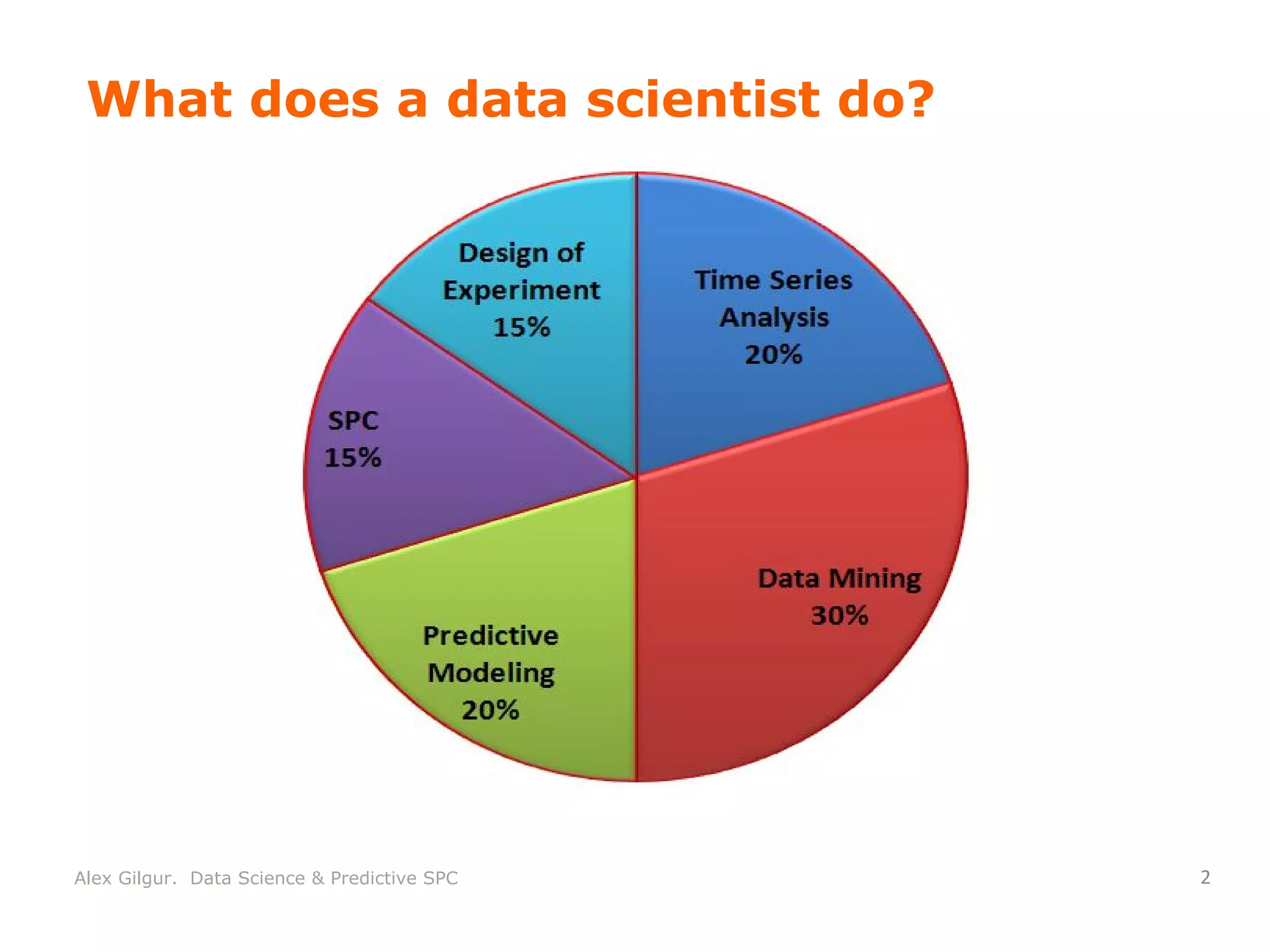 The document discusses various topics related to data science including what a data scientist does, the Maslow pyramid of data science, data science compared to nuclear energy, and whether data or information should be the goal. It also discusses data analysis techniques like time series forecasting methods, the central limit theorem, control charts, and quality metrics. Key points include discussing EWMA, ARIMA, and regression forecasting models and when each is best to use.