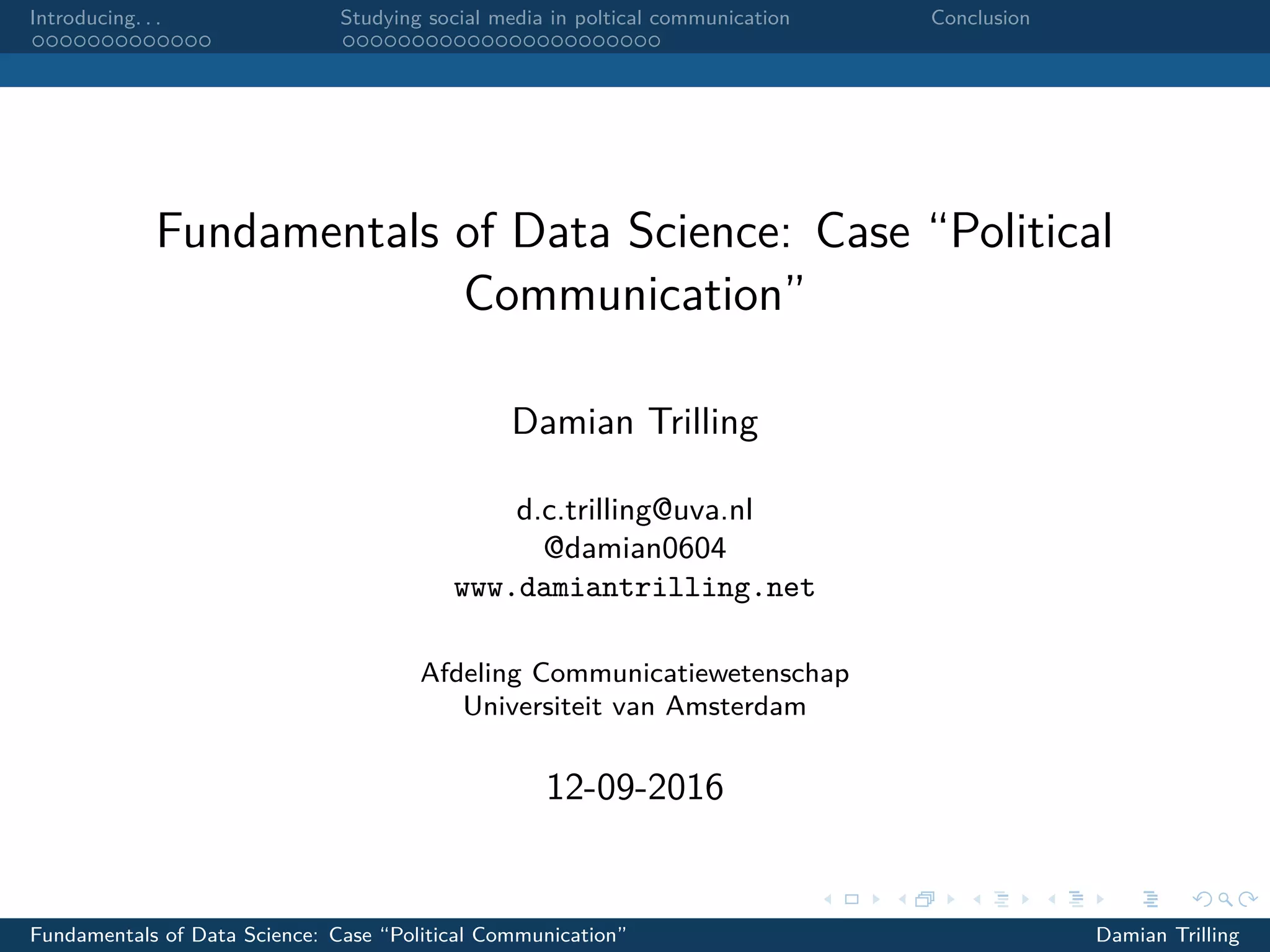 This document introduces the topic of studying social media in political communication. It discusses how social media may contribute to selective exposure, fragmentation, and polarization due to people selectively exposing themselves to ideologically congruent content. It also examines how politicians are using social media to directly communicate with citizens. The case study aims to leverage computational social science methods and large-scale data analysis to provide new insights into these topics. Students will work on a project analyzing political content on social media over the course of the case study.