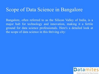 The document outlines the scope and opportunities for data science professionals in Bangalore, emphasizing the city's status as a technological hub with a vibrant startup culture and various industry applications. It provides information on upcoming data science certification courses offered by Datamites, including course details and specific training dates in December 2024. Bangalore's educational institutions and training centers contribute to a steady supply of skilled professionals in this field.