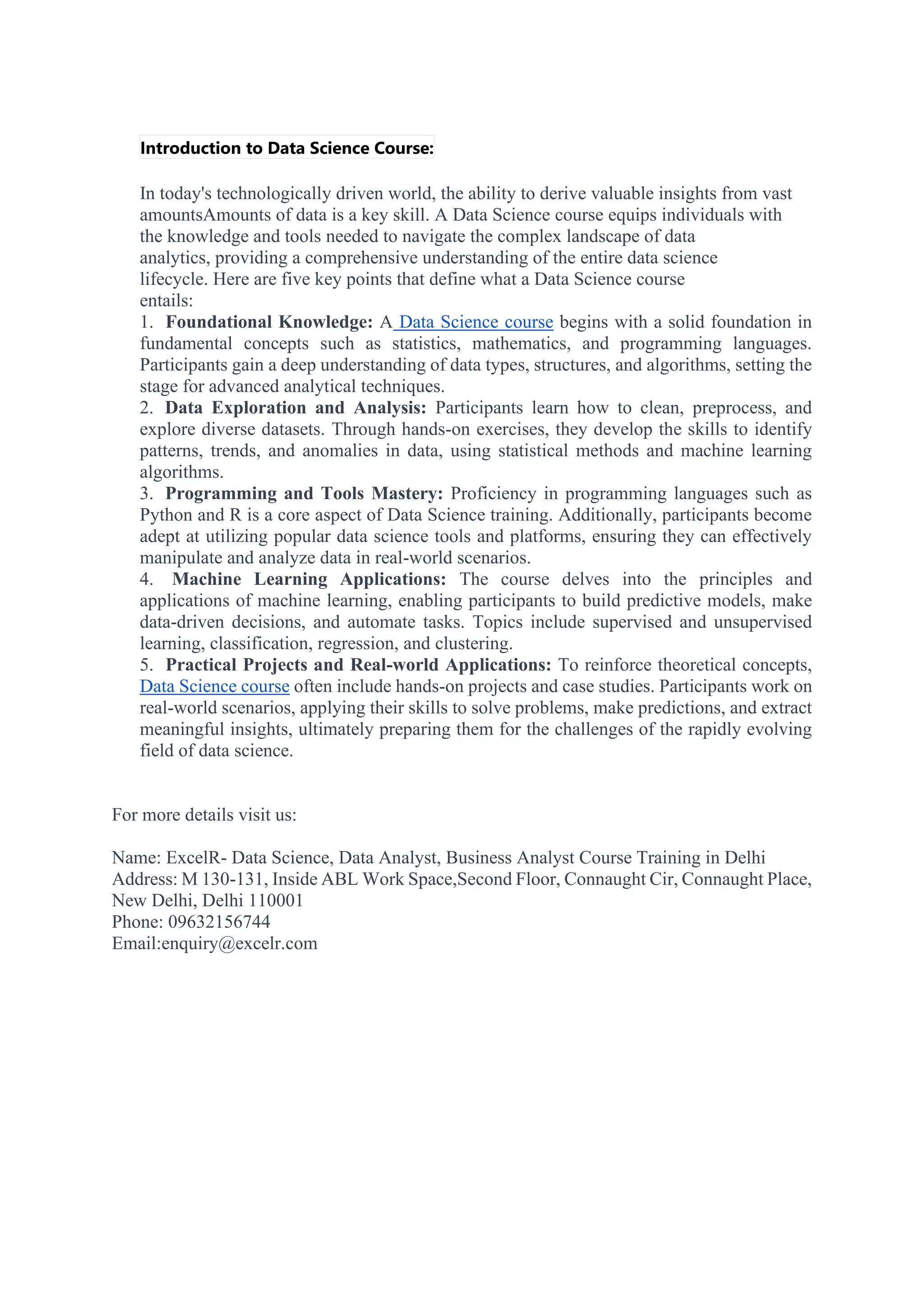 The document provides an overview of a data science course that equips individuals with essential skills for data analytics, covering foundational knowledge in statistics, mathematics, and programming. Participants learn data exploration, programming tool mastery, and machine learning applications while engaging in hands-on projects to apply their knowledge in real-world scenarios. For further details, contact ExcelR in New Delhi.