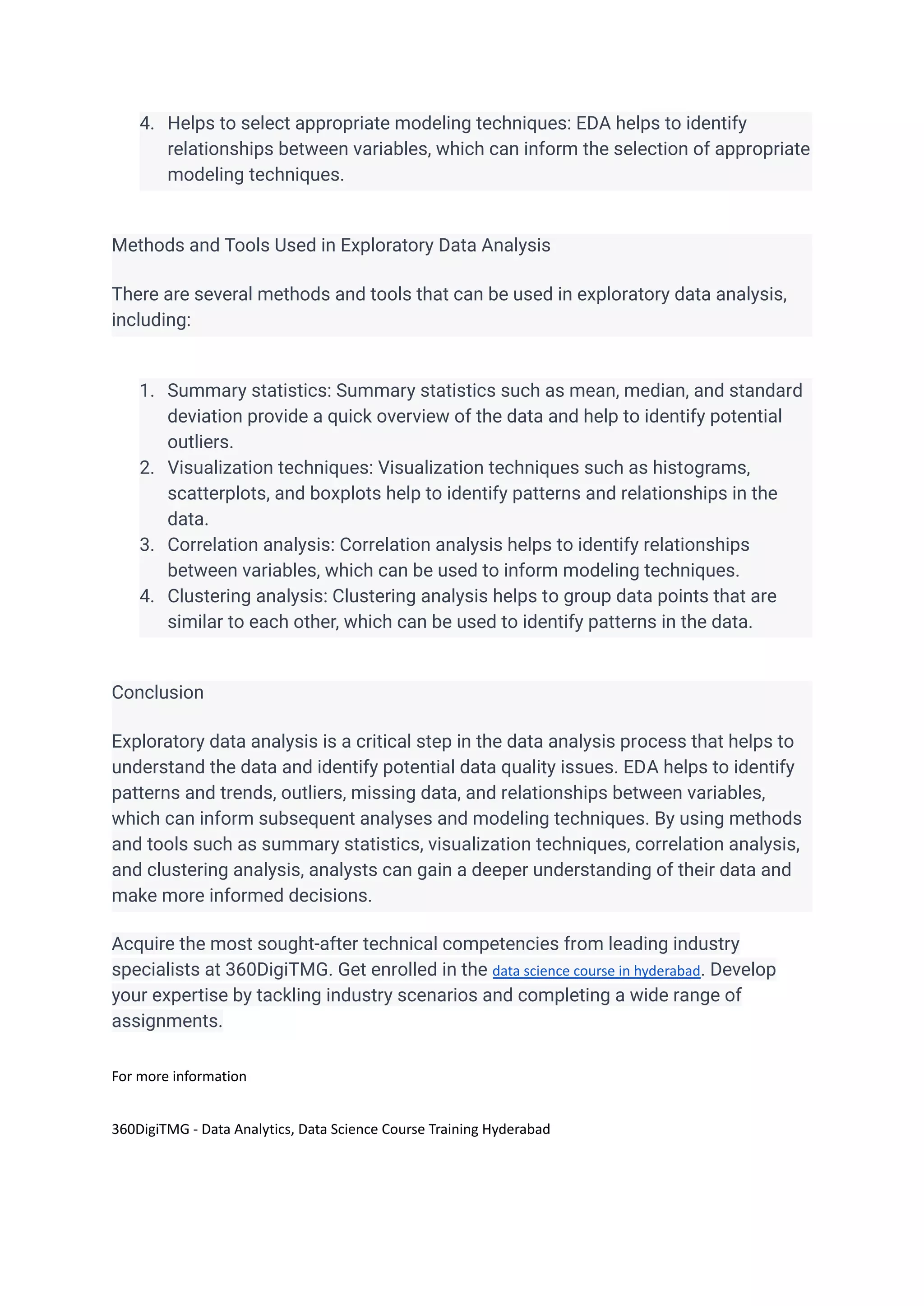 Exploratory Data Analysis (EDA) is a key technique in data analysis that involves summarizing data to uncover patterns, trends, and relationships between variables. EDA aids in identifying outliers and missing data, which can significantly affect the results of subsequent analyses, and employs methods such as summary statistics, visualization techniques, and correlation analysis. Overall, EDA is essential for understanding data quality and informing appropriate modeling techniques.