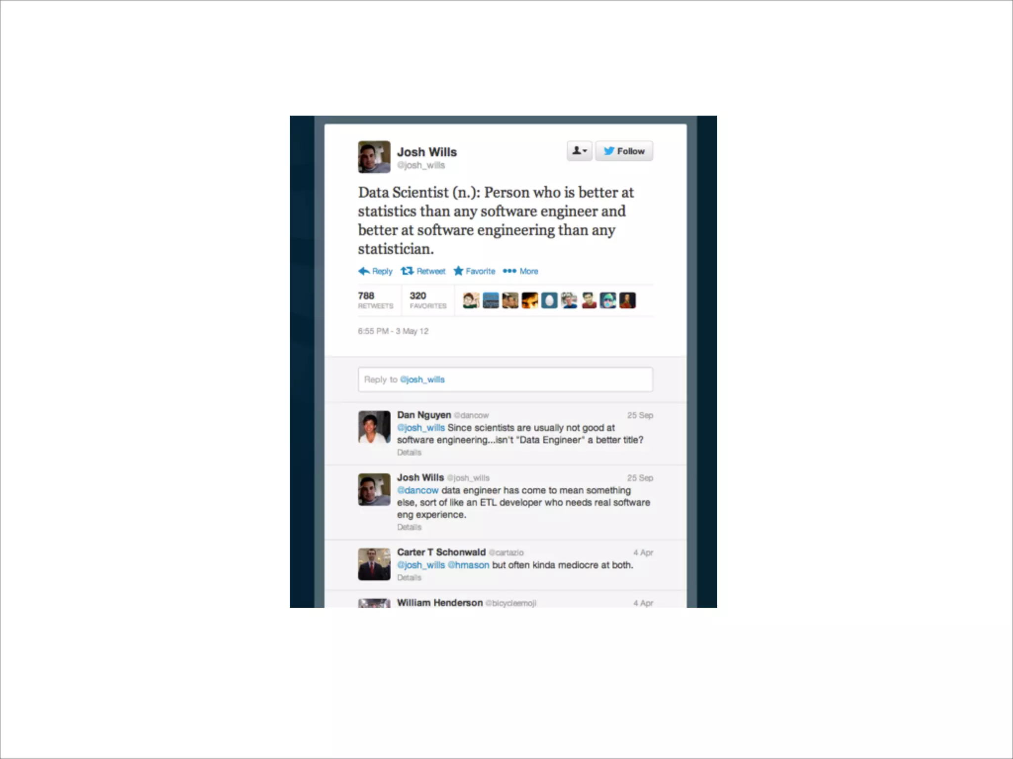Skills Portfolio Data scientistsuse three kinds of languages: analysis (R- Matlab), scripting (python, perl), data processing (sql, pig) ! Analytical environments should allow integration of languages / capabilities they offer. ! Every analyst has their preferred language / method - defaults to using their own for analytical efforts. True within centralized analytical teams.