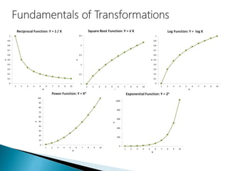 The document provides a comprehensive overview of exploratory data analysis (EDA), highlighting its importance in understanding data, data transformations, and modeling techniques. Key concepts include data munging, descriptive statistics, and correlation metrics, along with methods for handling missing values and outliers. It emphasizes the need for appropriate data transformation techniques to achieve linearity and improve model performance.