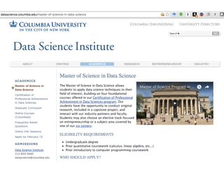The document discusses the evolution and definitions of data science, highlighting its distinctions in academia and industry since 2009. It emphasizes the increasing relevance of data analysis and machine learning, referencing historical contributions and contemporary developments at organizations like The New York Times. Additionally, it outlines the interconnected skill sets necessary for data science, including data analytics, data engineering, and related fields.