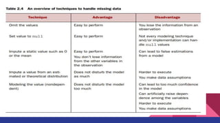 1. The data science process involves 6 steps: setting goals, retrieving data from internal and external sources, data preparation including cleansing, combining data through joins and appends, exploratory data analysis, building models through an iterative process of selecting techniques and variables, and presenting results for automation.