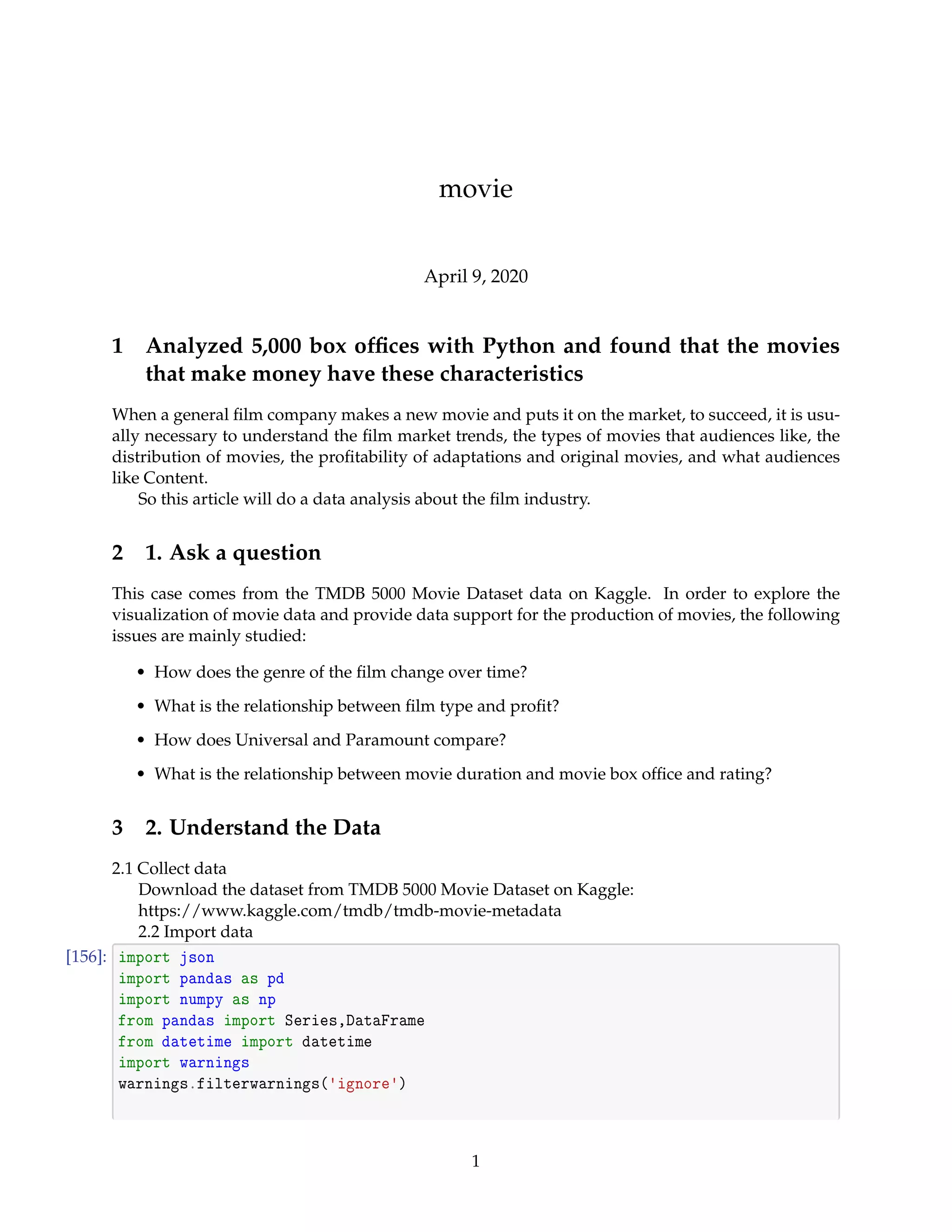 The document analyzes movie data from the TMDB 5000 Movie Dataset to understand characteristics of profitable movies. It explores relationships between genres, movie types and profits over time. The data is cleaned by merging movie and credits datasets, selecting relevant columns, and filling in missing values for release date and runtime. Three main issues are studied: how genres change over time, the relationship between type and profit, and comparisons between production companies.