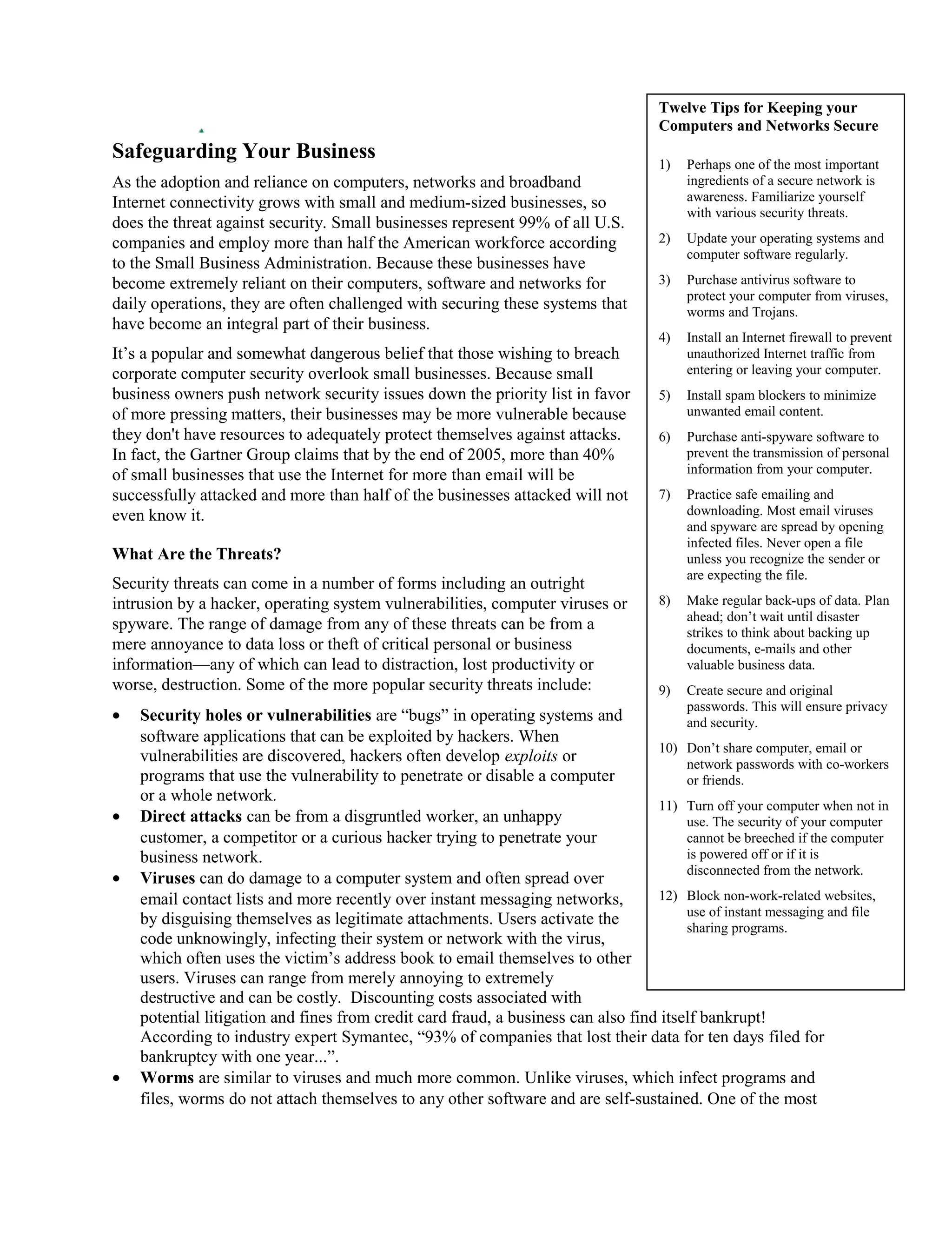 As small businesses have become increasingly reliant on computers and networks, the threats to their security have also grown. Small businesses are often challenged to secure their systems as they have limited resources. Over 40% of small businesses using the internet for more than email will be successfully attacked by the end of 2005, with over half not even realizing it. Security threats to businesses can come in many forms, including hacker intrusions, viruses, spyware, and more, which can potentially cause data loss, theft of information, and bankruptcy. It is important for small businesses to take basic steps to protect their computers and networks such as keeping software updated, using firewalls and antivirus software, and practicing safe email and internet habits.
