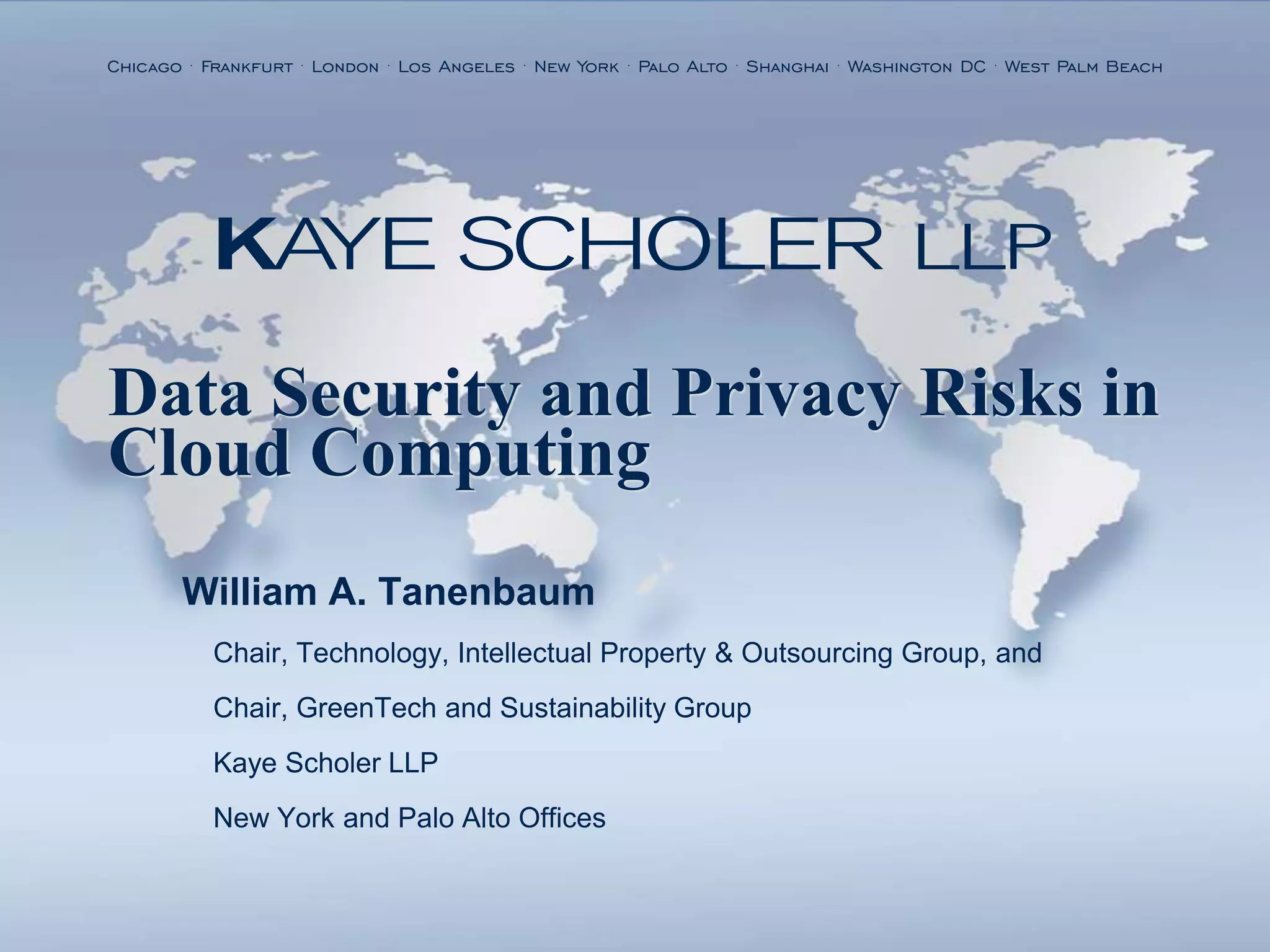 This document discusses data security and privacy risks associated with cloud computing. It identifies 8 key risks: 1) regulatory requirements regarding data security and privacy, 2) practical data hazards like weak access protection, 3) meeting legal holds for litigation documents, 4) complying with European data privacy laws, 5) low-cost cloud providers having limited protections and liability, 6) tier 1 cloud providers still potentially falling short of legal obligations, 7) insufficient control over software changes, and 8) responsibility for costs of database breaches. The document is presented by William Tanenbaum, chair of the technology and outsourcing group at Kaye Scholer LLP, to highlight legal and practical risks companies should consider regarding data security and privacy