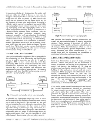 The document discusses data security in digital communications, emphasizing the importance of Public Key Infrastructure (PKI) and cryptographic algorithms like MD5 and RSA for secure transactions. It explains how PKI facilitates the distribution and management of digital certificates and public keys, ensuring authentication, integrity, and confidentiality. The paper also details the functions and components of PKI, including certification authorities, registration authorities, digital signatures, and the RSA algorithm for encrypting messages.