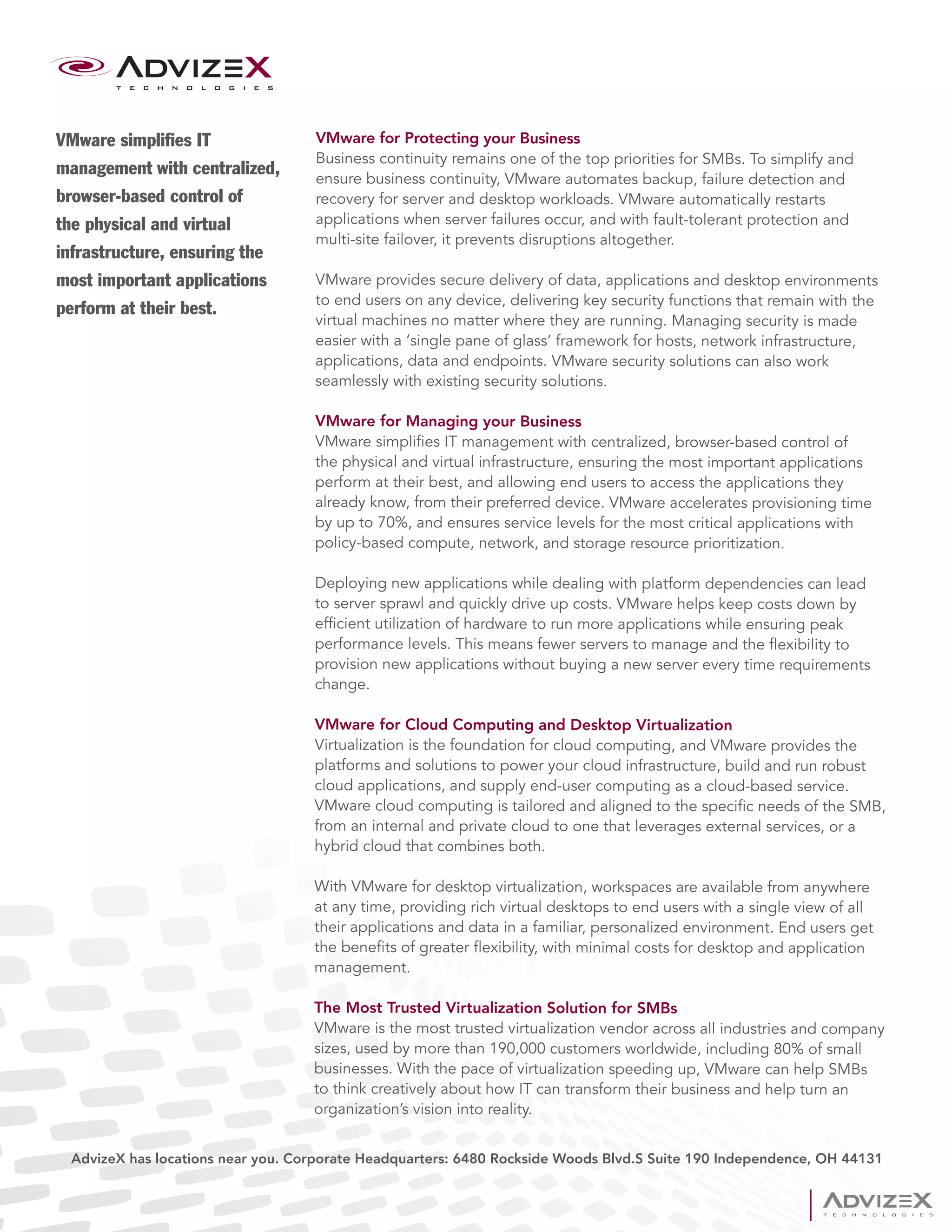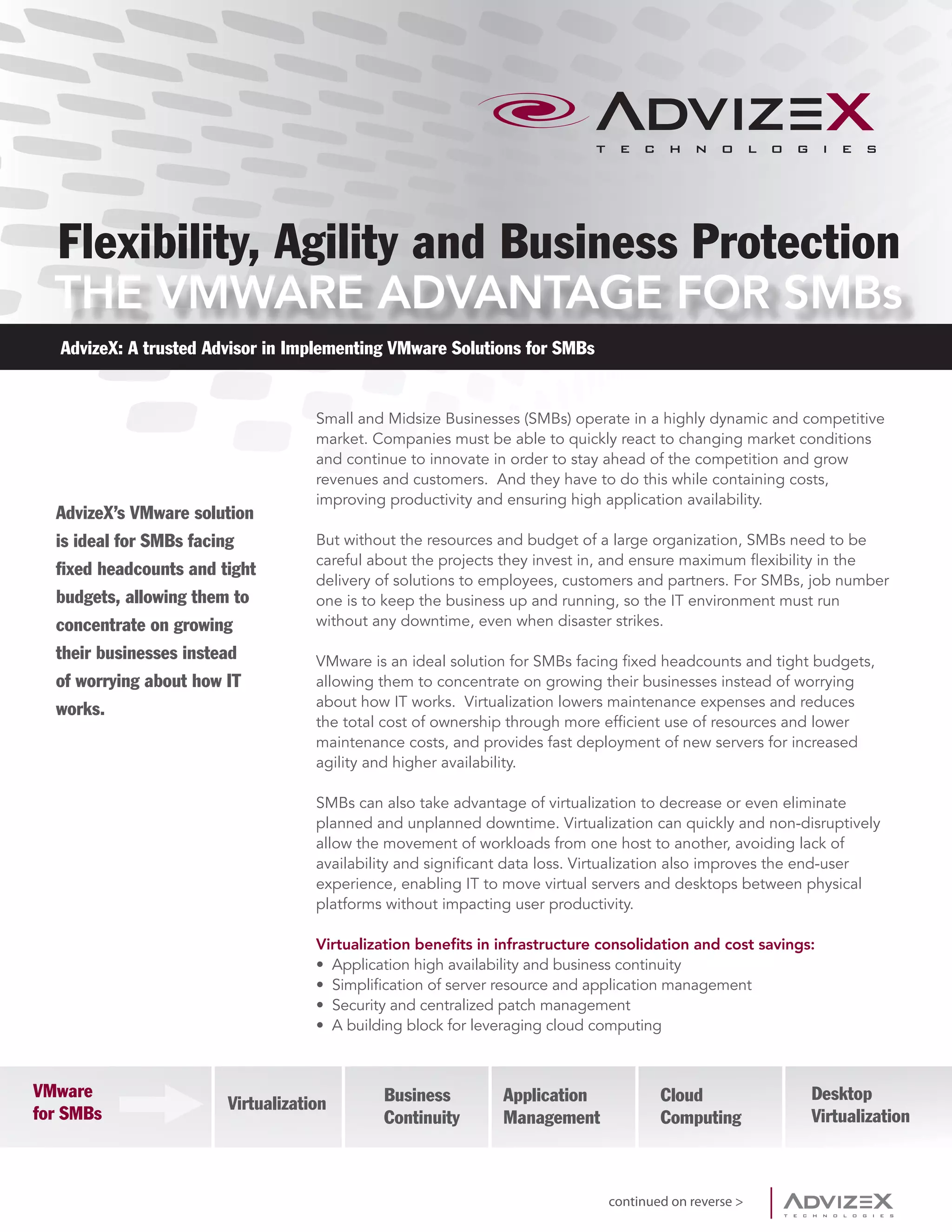 VMware virtualization solutions provide SMBs with flexibility, agility and business protection by allowing efficient use of resources to reduce costs, provide high availability of applications, and ensure business continuity even during disasters. Virtualization improves productivity and the end user experience while simplifying management. AdvizeX is an expert advisor that can help SMBs implement the ideal VMware solutions.