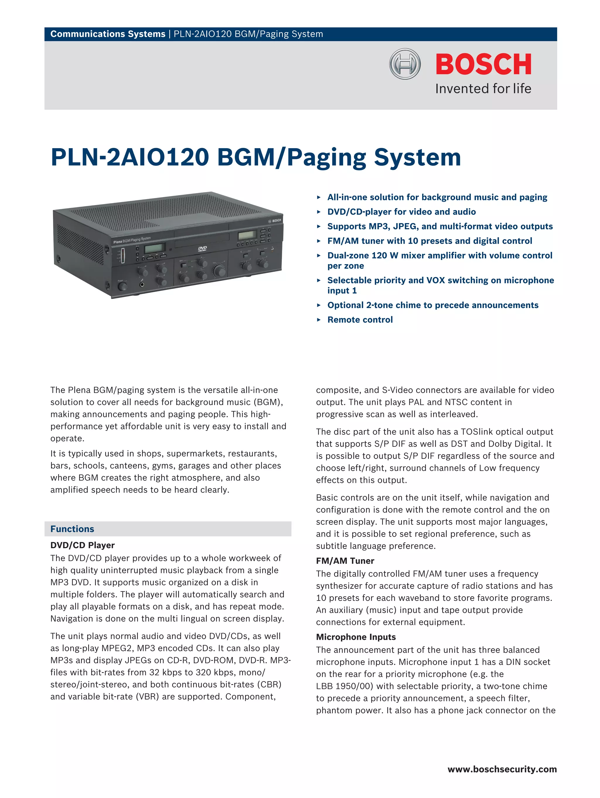 The PLN-2AIO120 is an all-in-one background music and paging system that includes a DVD/CD player, FM/AM tuner, microphone inputs, and dual-zone amplifier. It provides versatile playback of audio and video content for background music and announcements. Key features include MP3/video playback from discs, an FM/AM radio, priority microphone input, and separate volume control for two speaker zones.