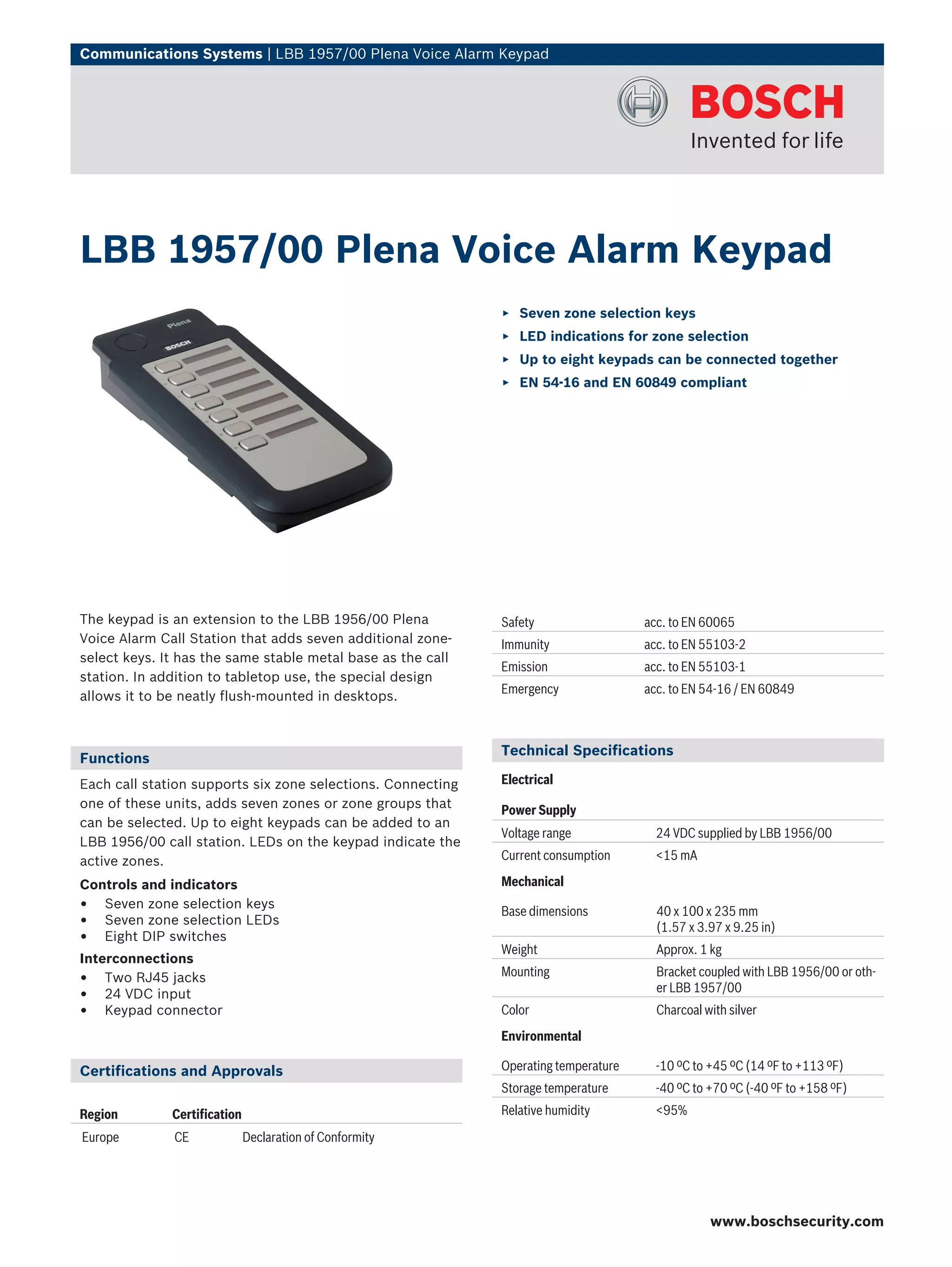 The LBB 1957/00 Plena Voice Alarm Keypad is an extension to the LBB 1956/00 Plena Voice Alarm Call Station that adds seven additional zone selection keys. It connects to the call station and allows selection of up to seven additional zones or zone groups. Up to eight keypads can be connected to a single call station. The keypad uses LED indicators to show the active zones and has a durable metal base for tabletop or flush mounting.
