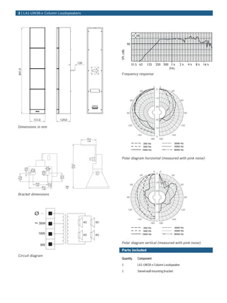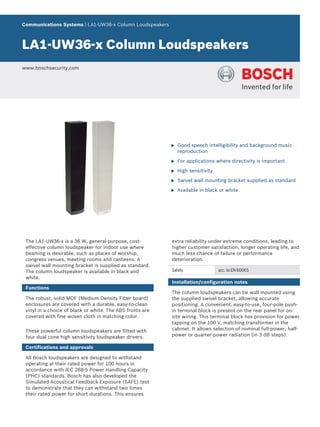 The LA1-UW36-x is a 36W column loudspeaker for indoor use where directivity is important. It has high sensitivity and provides good speech intelligibility and background music reproduction. It has a swivel wall mounting bracket and is available in black or white. It uses four dual cone drivers and a durable MDF enclosure for reliability under extreme conditions.