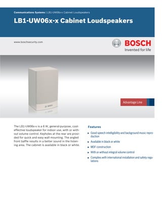 The LB1-UW06x-x is a 6W indoor cabinet loudspeaker available in black or white. It provides good speech intelligibility and background music reproduction within its effective frequency range of 180Hz to 20kHz. Keyholes on the rear allow for quick and easy wall mounting. It can be used with or without an integral volume control.