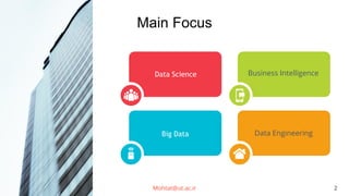 The document outlines essential skills and technologies necessary for careers in data science, big data, and business intelligence, emphasizing expertise in programming languages like Python and R, as well as tools such as TensorFlow and Tableau. It discusses the various roles within data science, including data scientists and engineers, along with the significance of big data analytics in making informed business decisions. Additionally, it highlights educational resources and courses available for individuals seeking to enhance their data skills.