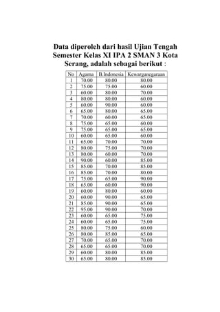 Dokumen ini memberikan ringkuman tentang analisis varians satu arah (ANOVA) untuk menguji perbedaan rata-rata nilai ujian tiga mata pelajaran. Hasil ANOVA menunjukkan tidak ada perbedaan rata-rata yang signifikan di antara ketiga mata pelajaran.