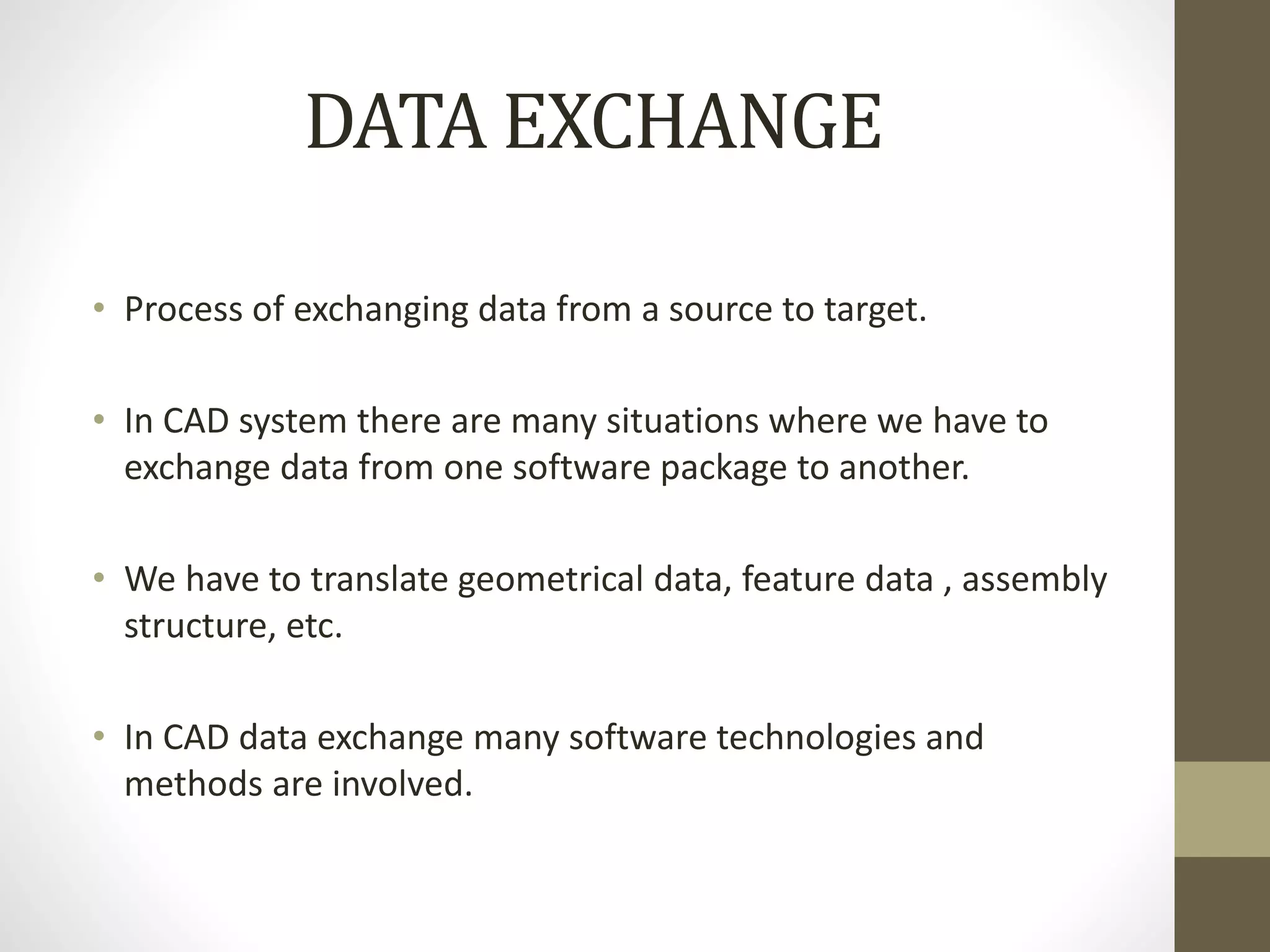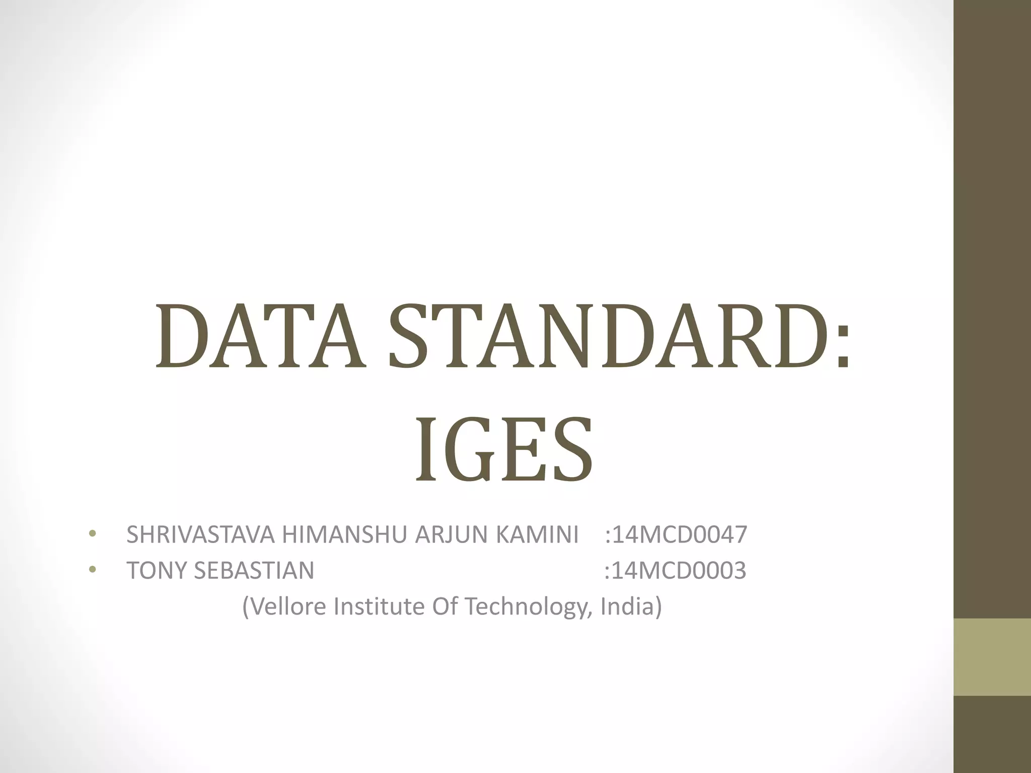 The document discusses the Initial Graphics Exchange Specification (IGES) format, which is a neutral file format used for CAD data exchange between different software packages. It describes the key components of an IGES file, including the start section, global section, directory entry section, parameter data section, and terminal section. The global section provides metadata about the file. The directory entry and parameter data sections define the geometric entities using parameters. Common entities that can be represented include lines, circles, surfaces of revolution. IGES aims to enable translation between different CAD systems by providing a common format for exchange of geometry and topology data.