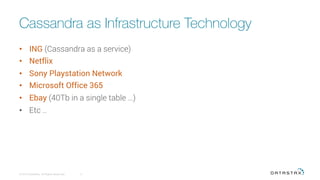 This document discusses Cassandra and the Datastax Academy. It provides examples of companies using Cassandra as infrastructure including ING, Netflix, Sony, and Microsoft. It also discusses the increasing SQL support in Cassandra, such as user defined functions, materialized views, and secondary indexes. The document notes that skills in Cassandra are in high demand but difficult to find. It promotes the Datastax Academy as a free solution to this problem, offering self-paced courses, instructor-led training, and O'Reilly certification to boost careers.