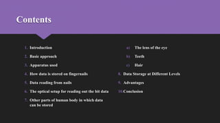 This document discusses using femtosecond laser pulses to store data in human fingernails. Researchers have demonstrated storing up to 5 megabits of data in fingernails that can be read for up to 6 months as the nail grows out. Data is written by focusing femtosecond laser pulses inside the nail, causing structural changes in keratin proteins detected as increased fluorescence using a microscope. This allows for high density data storage of 2 gigabits per cubic centimeter. The technique provides a secure way to store personal identification or other sensitive data within the body.