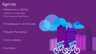 The document discusses various database systems, focusing on the distinctions between relational (SQL), non-relational (NoSQL), and modern relational databases (NewSQL), along with their definitions and examples. It highlights the emergence of polyglot persistence, emphasizing the importance of choosing the right database based on use cases, scalability, and data types. The document includes practical examples, classification of databases, and coding snippets, illustrating the applications of different database technologies.
