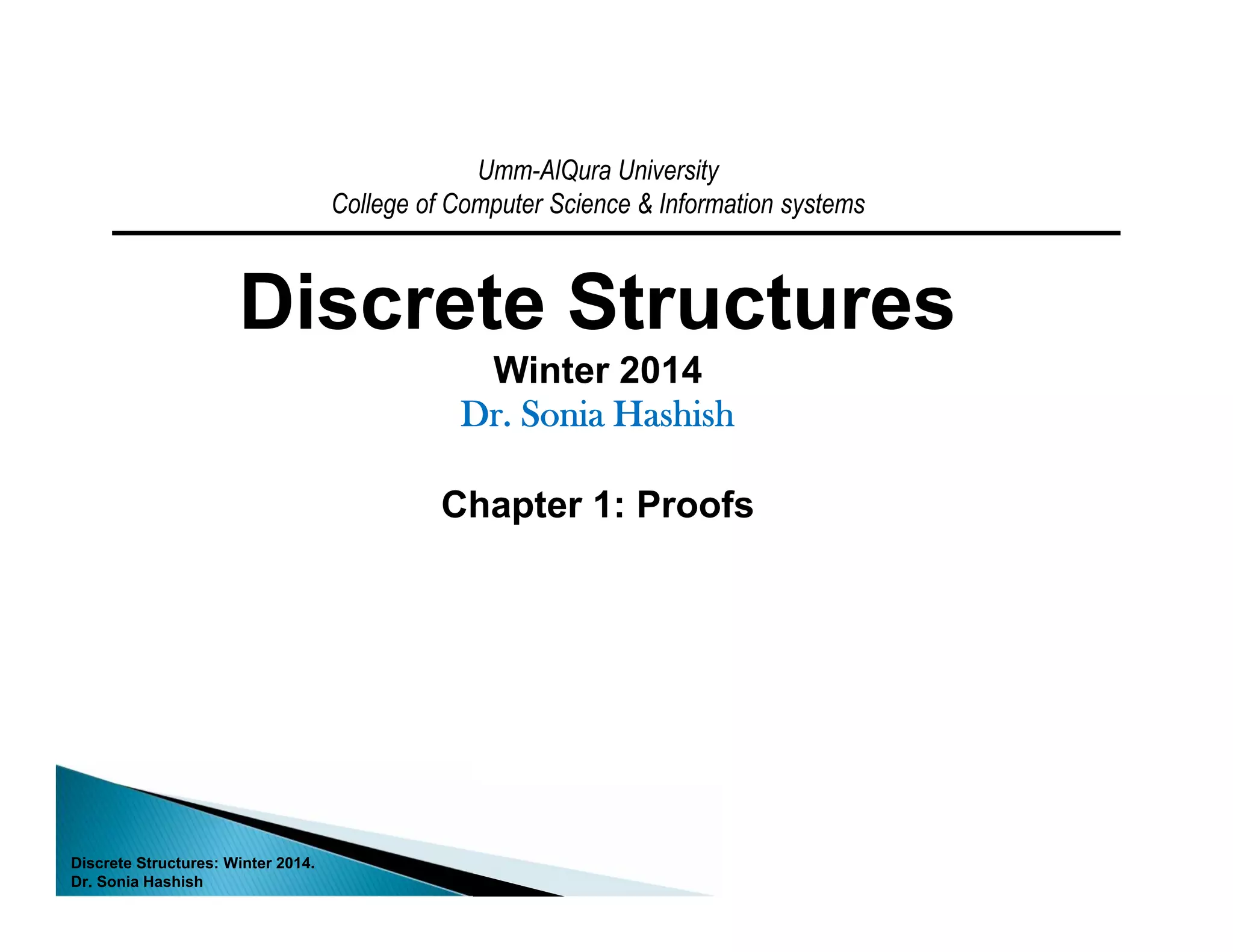 This document provides an overview of key concepts related to proofs in discrete structures including: