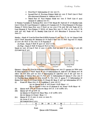 The document covers data structures, detailing linear and non-linear types, such as arrays, linked lists, stacks, queues, trees, and graphs. It explains operations related to these structures, including traversing, searching, insertion, deletion, and updating. Additionally, it discusses abstract data types and algorithm analysis with regards to time and space complexity.