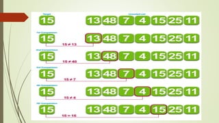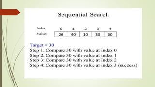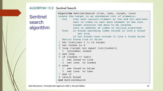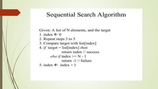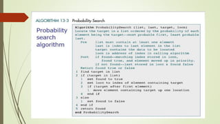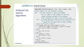 The document discusses different types of searching algorithms for lists. It describes linear/sequential search which searches the entire list sequentially to find a target. Binary search requires an ordered list and works by dividing the list in half on each step to search for the target. The document provides pseudocode for linear search and binary search algorithms. It also discusses variations of linear search like sentinel search and search of ordered lists. Binary search has better efficiency of O(log n) compared to O(n) for linear search.