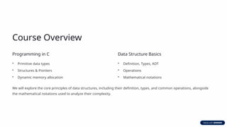 We will explore the core principles of data structures, including their definition, types, and common operations, alongside