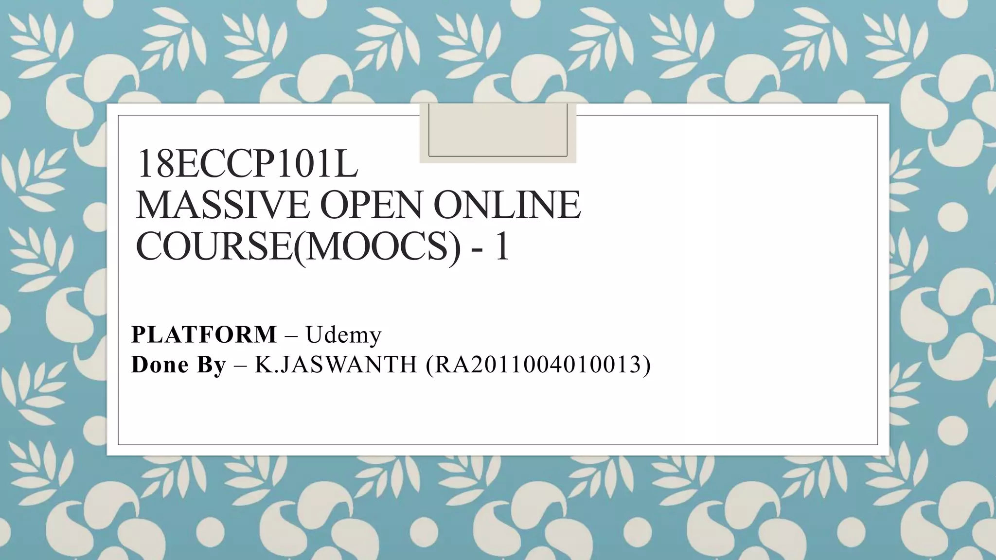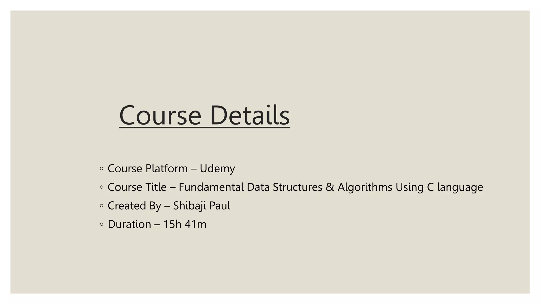 This document summarizes a massive open online course on Udemy about fundamental data structures and algorithms using the C language. The 15-hour course covers key topics like stacks, queues, linked lists, trees, recursion, and analyzing algorithm efficiency. It aims to help students strengthen programming skills and prepare for technical interviews at top companies. The course consists of 14 sections and includes weekly quizzes on the Udemy platform.