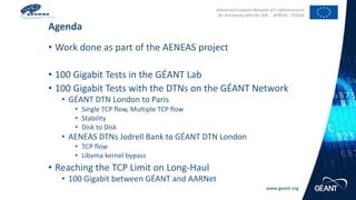 - TCP transfers reached plateau throughput of 37.1 Gbit/s for a single flow and 75 Gbit/s for multiple flows between London and Paris over the GÉANT network.