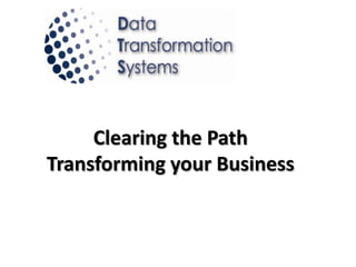 Data Transformation Systems offers business process consulting services to streamline workflows, information and paper flows, and provide user-friendly systems using existing software to make businesses more lean and profitable. The company analyzes each department's procedures, paperwork, and software use to identify unnecessary tasks and redesign processes and documentation flows to integrate systems using databases and reduce manual data entry. The goal is to conduct a comprehensive analysis of the general and departmental information flows, identify unnecessary steps, and design an integrated system to cut costs while leveraging existing technologies.