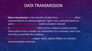 - Data transmission involves transferring electromagnetic signals over a physical communication channel like copper wires or wireless channels.