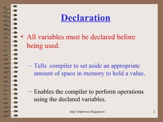 The document discusses fundamental data types in C including integer, floating point, character, and void types. It describes how variables must be declared before use and explains basic type modifiers like short, long, and unsigned. The summary also covers integer storage sizes and ranges, floating point precision and representation, and type conversions in C using casts and arithmetic promotion.