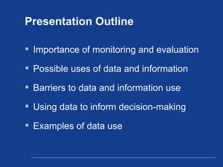 This document discusses the importance of using monitoring and evaluation (M&E) data to inform policy formulation, program planning, and improvement. It provides examples of how M&E data has been used in Nigeria to guide resource allocation and strengthen sub-national M&E systems. Barriers to data use include technical, organizational, individual, and political constraints. Ensuring data is effectively used requires understanding how it is produced and used, identifying and addressing barriers, and strengthening decision-making processes.