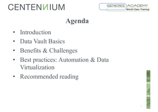 This document discusses Data Vault fundamentals and best practices. It introduces Data Vault modeling, which involves modeling hubs, links, and satellites to create an enterprise data warehouse that can integrate data sources, provide traceability and history, and adapt incrementally. The document recommends using data virtualization rather than physical data marts to distribute data from the Data Vault. It also provides recommendations for further reading on Data Vault, Ensemble modeling, data virtualization, and certification programs.