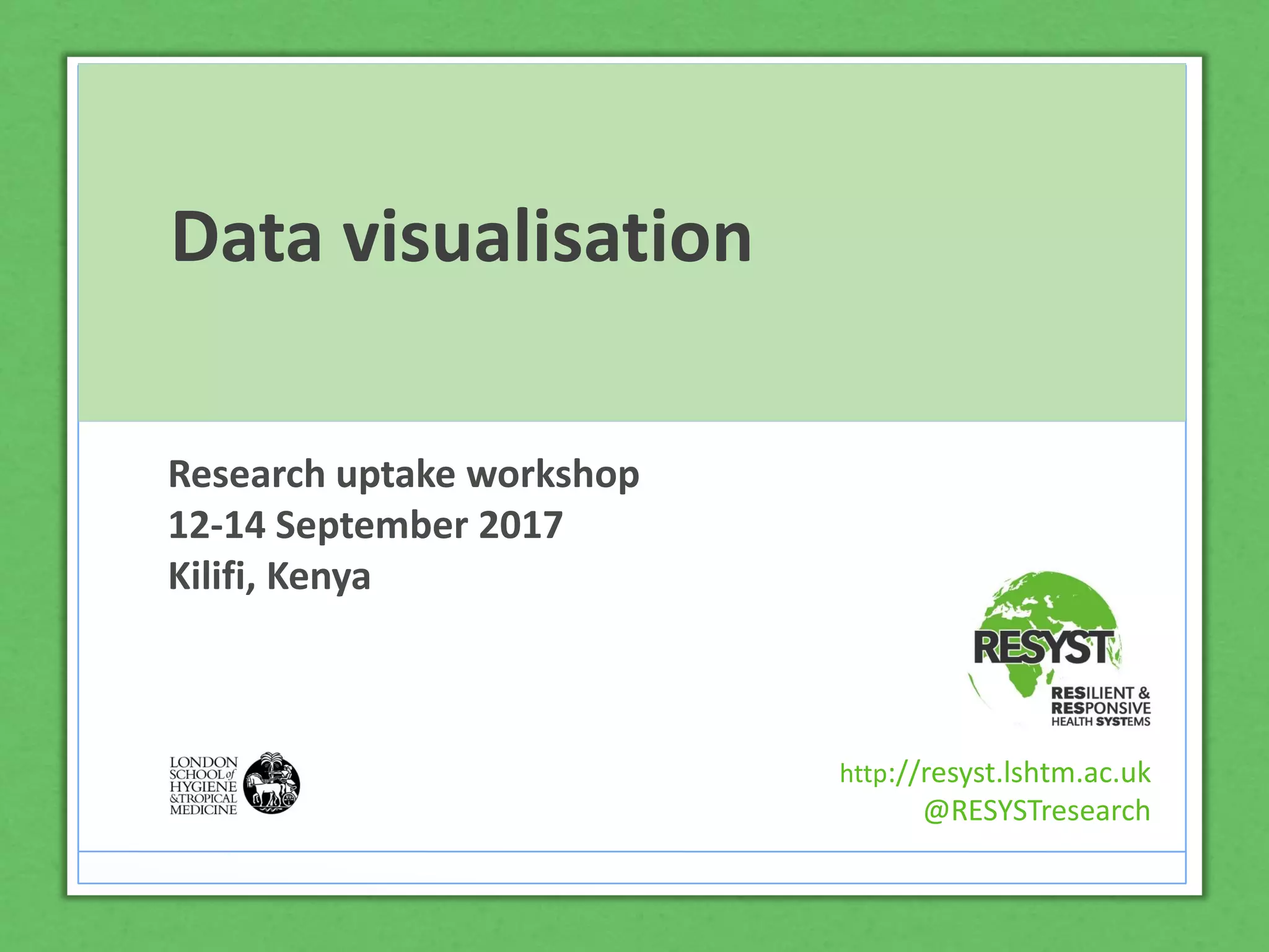 3) Online visualization tools like Infogram are also presented. The resource aims to demonstrate the value of data visualization for research communication and uptake.