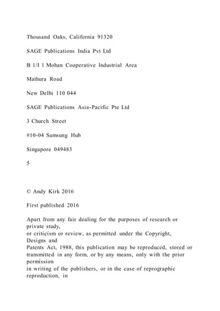 The document is a comprehensive handbook on data visualization authored by Andy Kirk, covering its definition, principles, workflows, and design solutions. It includes extensive references, illustrations, and examples aimed at enhancing visualization literacy. The structure of the book incorporates foundational concepts, hidden thinking processes, and capability development across various visualization aspects.