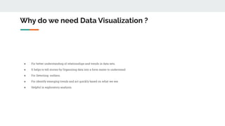 This document provides an introduction to data visualization and the Tableau tool. It discusses why visualization is important for understanding relationships in data and detecting trends. The key steps in visualization are outlined, such as preparing data, selecting a tool, transforming data, and identifying KPIs. Tableau is highlighted as a popular tool because it has an easy drag-and-drop interface and does not require programming. Tableau offers desktop, online, prep and server products. Examples are given of different chart types like bar graphs, scatter plots, and maps that can be created in Tableau.