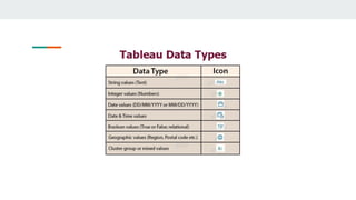 This document provides an overview of data types in Tableau including string, number, date, date and time, boolean, and geographic values. It describes how to connect to data in Tableau by selecting a file or server data source. It also discusses changing the data type of fields from the data pane or in a view and explains that dimensions contain qualitative values that affect detail level while measures contain quantitative values that can be aggregated. Finally, it lists some portals for finding open data sets.